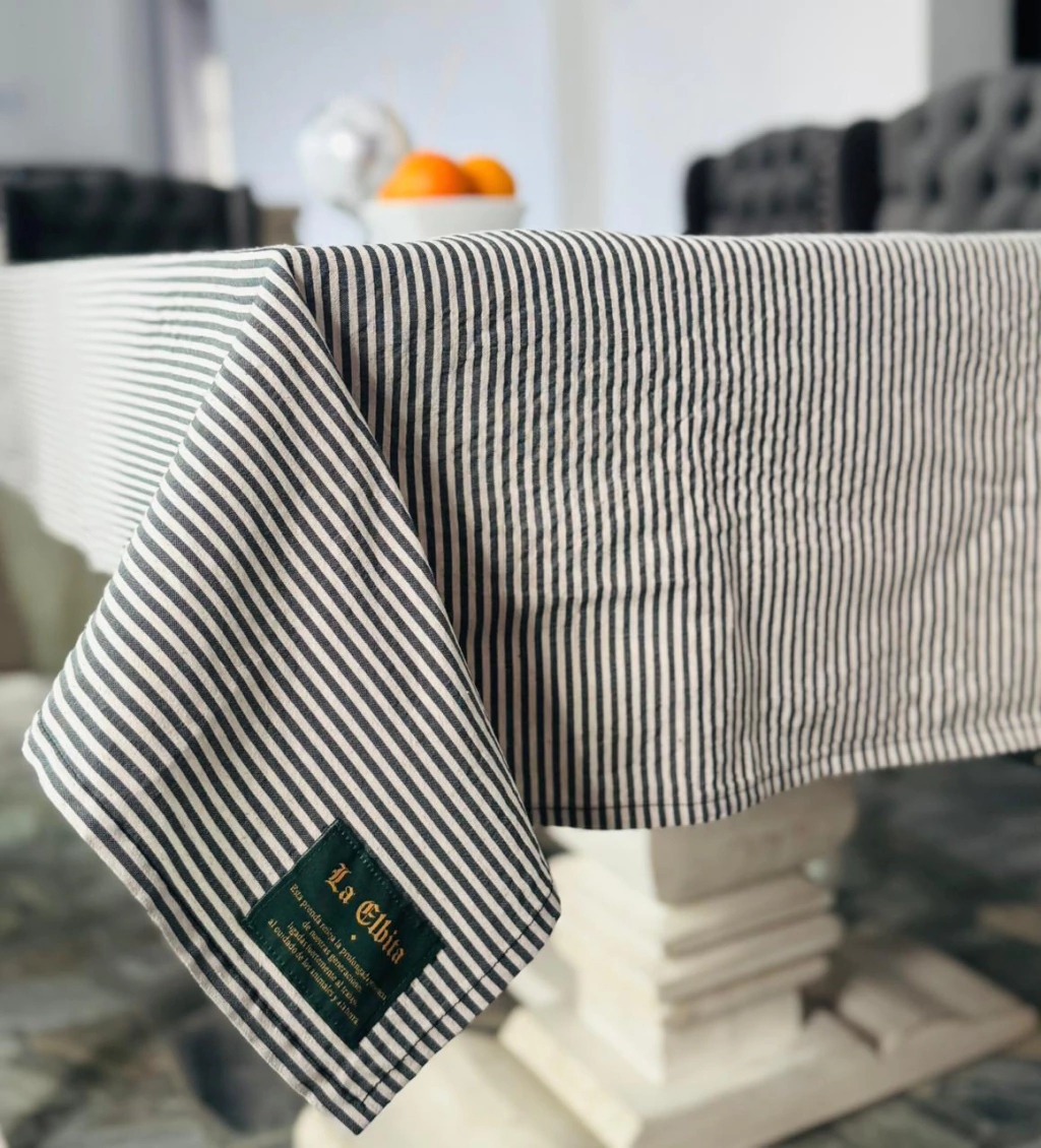 Aportá calidez y estilo a tu mesa con este mantel confeccionado en tusor de algodón rayado en tonos azul y crema, una combinación clásica que nunca pasa de moda. Su textura suave y natural invita a compartir momentos en familia, mientras que las rayas aportan un toque fresco y relajado, ideal tanto para interiores como para mesas al aire libre.